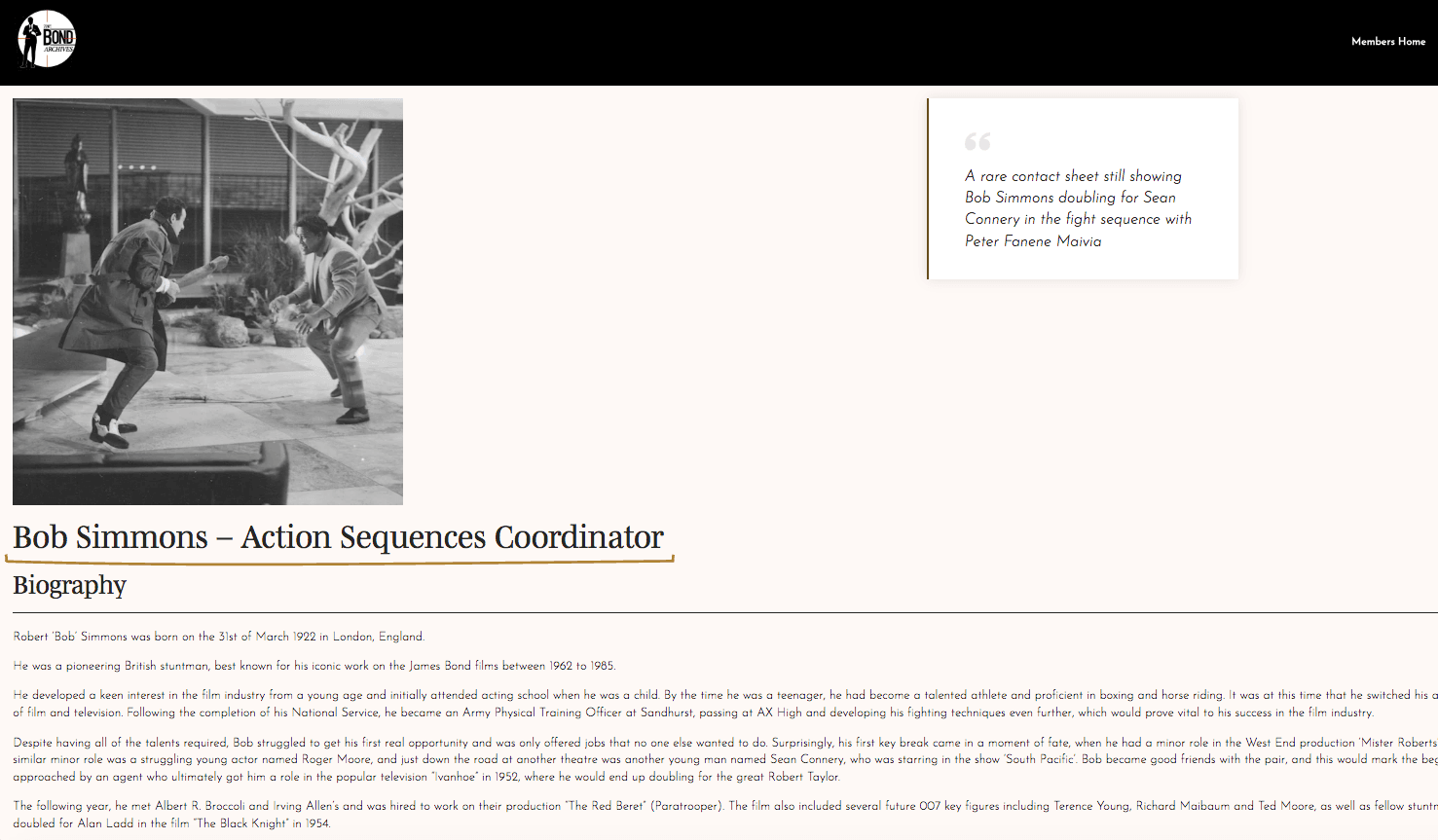 The Bond Archives contains the world's most detailed and comprehensive cast and crew list. From principal actors to extras, directors to stand-ins, title designers to stunt personnel. The Bond Archives are divided into films for easy navigation and for the moment the focus is on the Eon Productions. The non-Eon films will follow suit, as well as a ‘James Bond Related’ Archive which will focus on individuals not directly involved with a specific film. Never before seen images from the films, including behind the scenes crew pictures, rare stills and original contact sheet stills are exclusively available for subscribing members.
