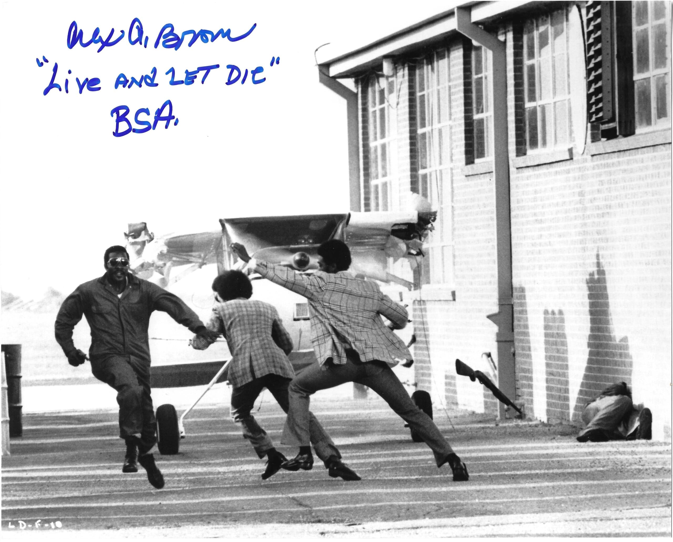 A rare publicity still shot showing Alex running down the alleyway at Lakefront Airport. It is one of the only James Bond photos he has ever signed!