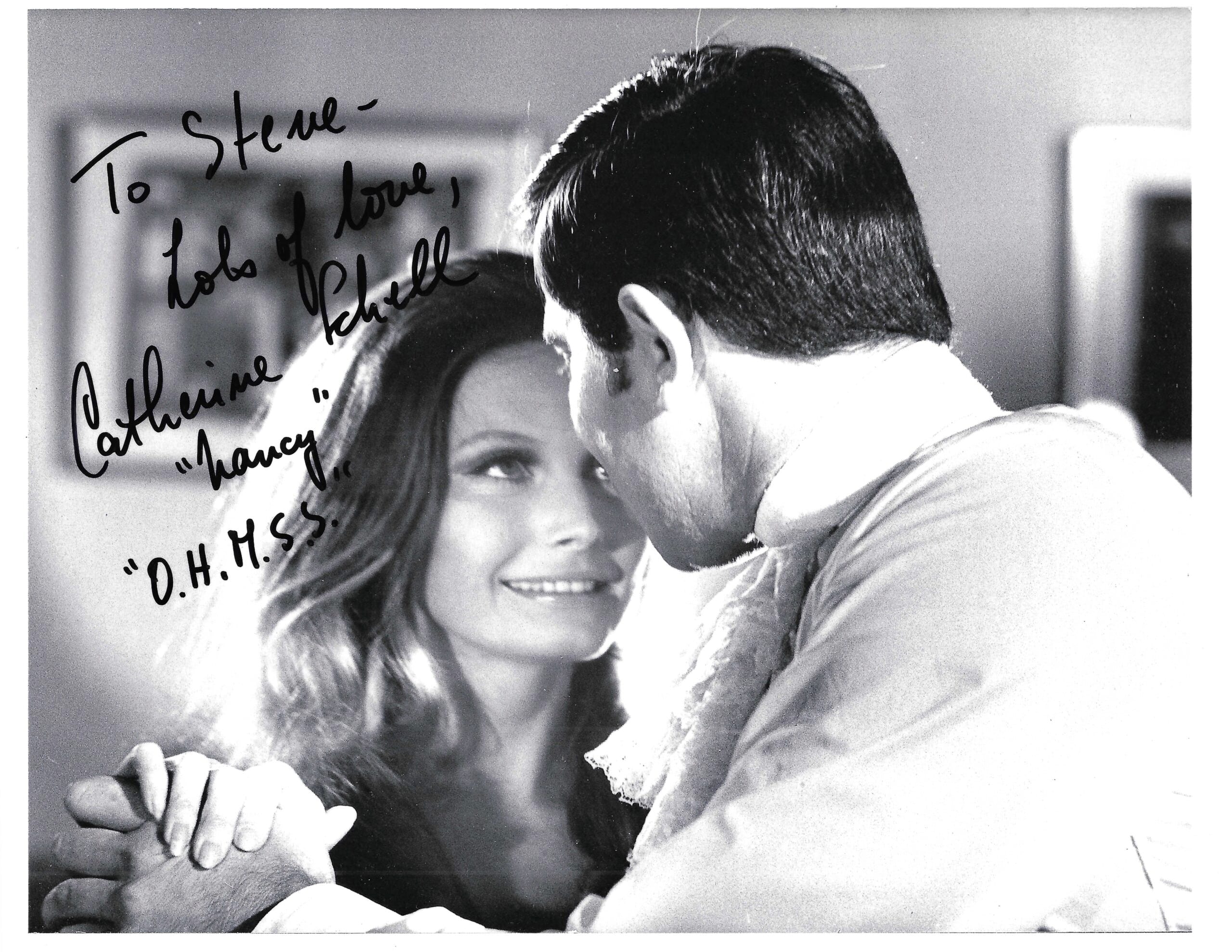 An 8×12 inch photograph of a rare production still, hand signed by actress Catherine von Schell.