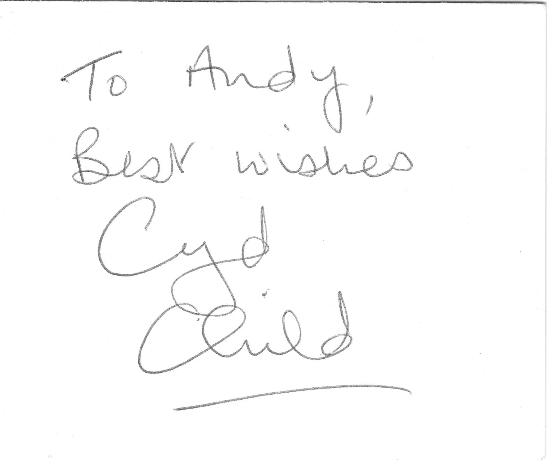 A white card hand signed by stuntwoman Cyd Child.