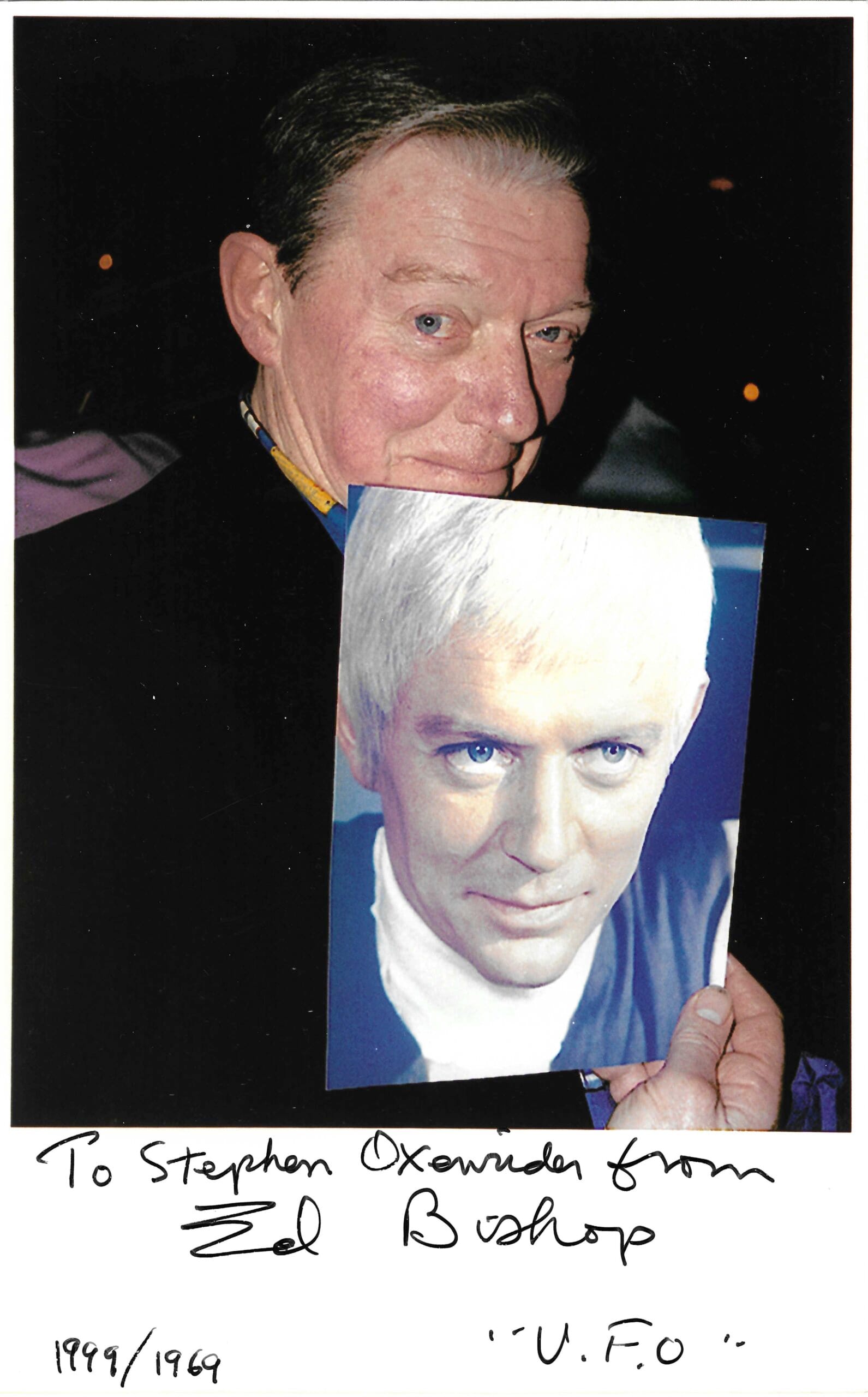 In this photo he is holding a shot of him as Ed Straker in the Gerry Anderson series “U.F.O.”