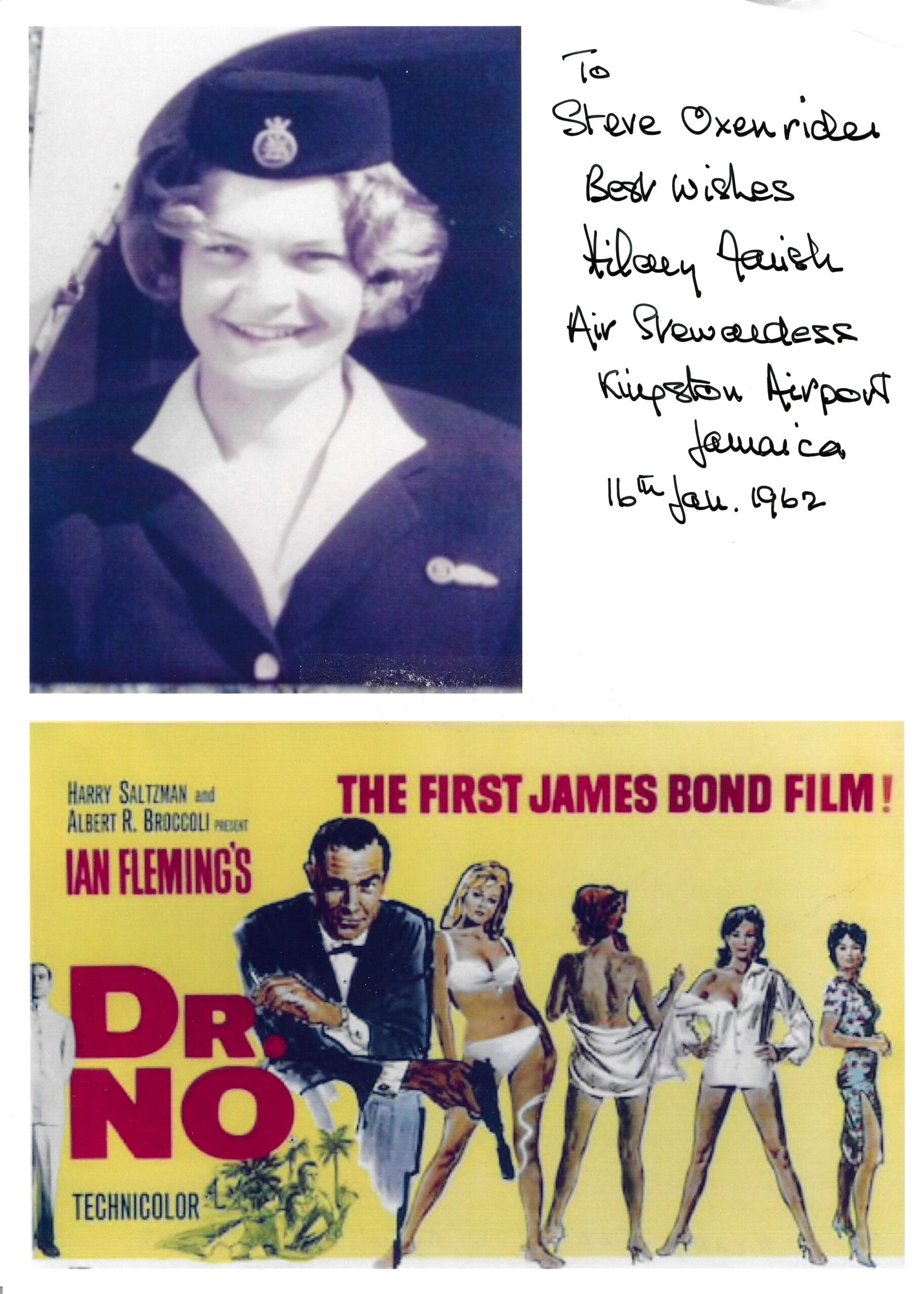 She had a brief role in “Dr. No” as one of the air stewardesses at the airport in Kingston, Jamaica. Unfortunately her close up ended up on the cutting room floor but she can be seen walking across the screen when James Bond gets to Mr. Jones’s car.
