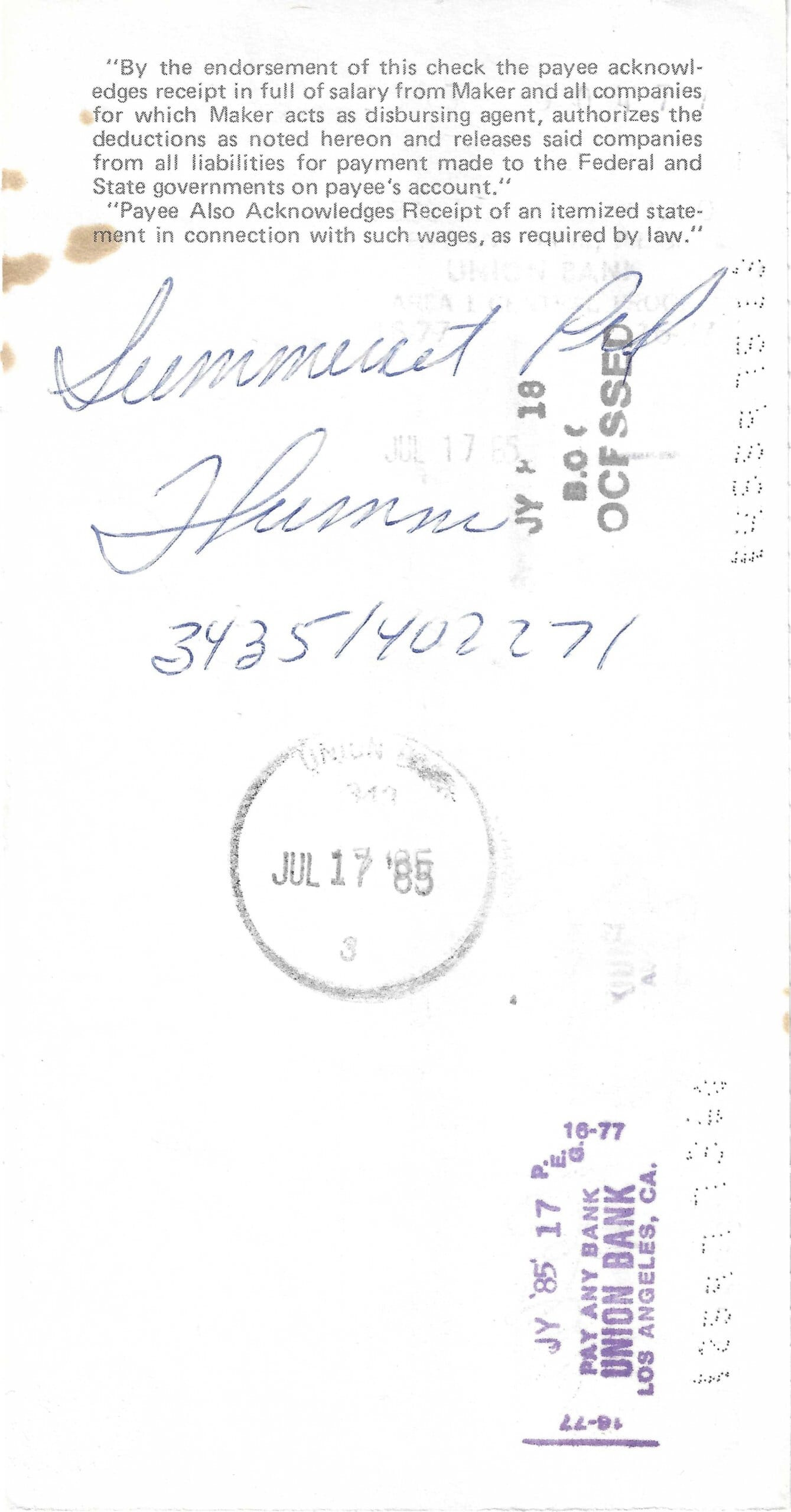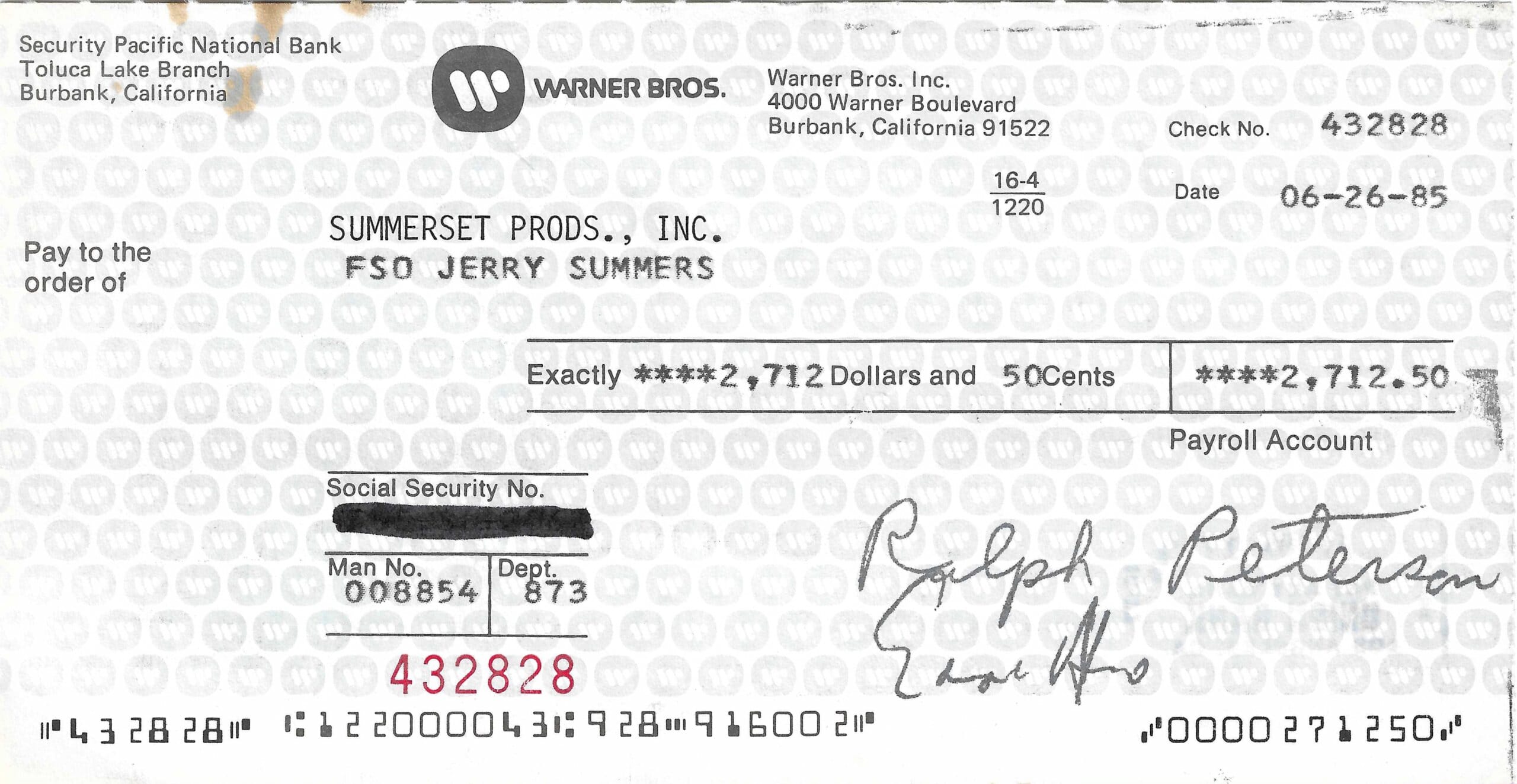 An original Warner Bros. Inc. cheque, dated 26th of June, 1985, to Jerry Summers, hand signed by him on the reverse.