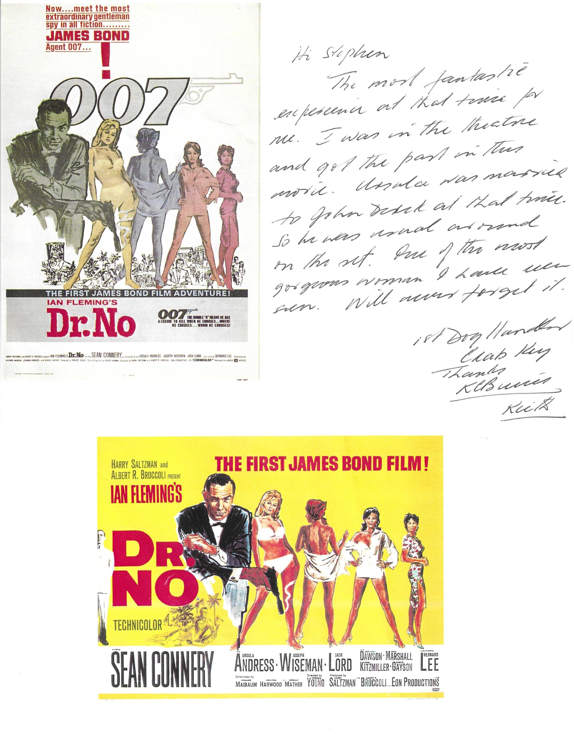 An A4 page showing two “Dr. No” poster, complete with a hand written note and signature of Keith Binns.
