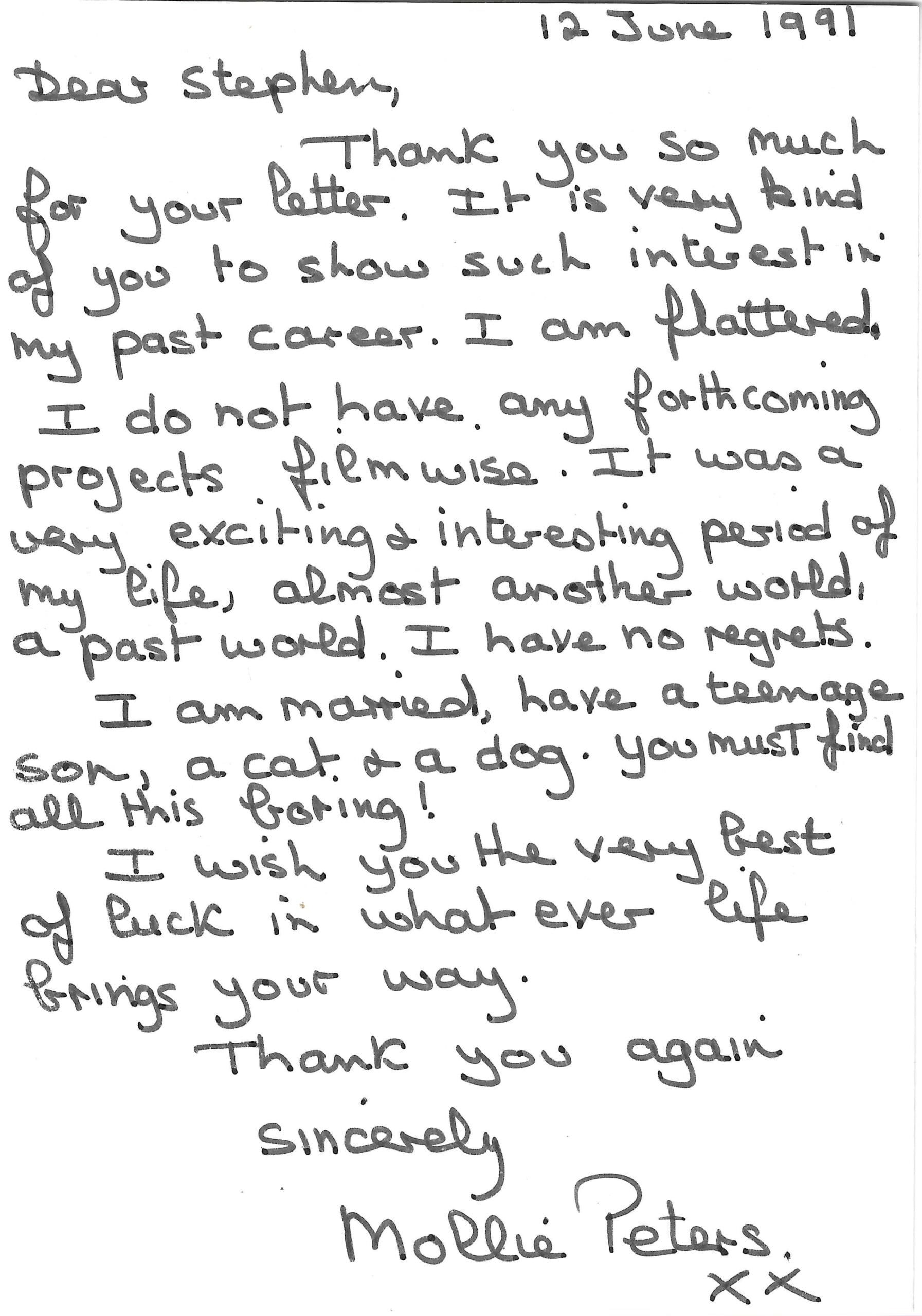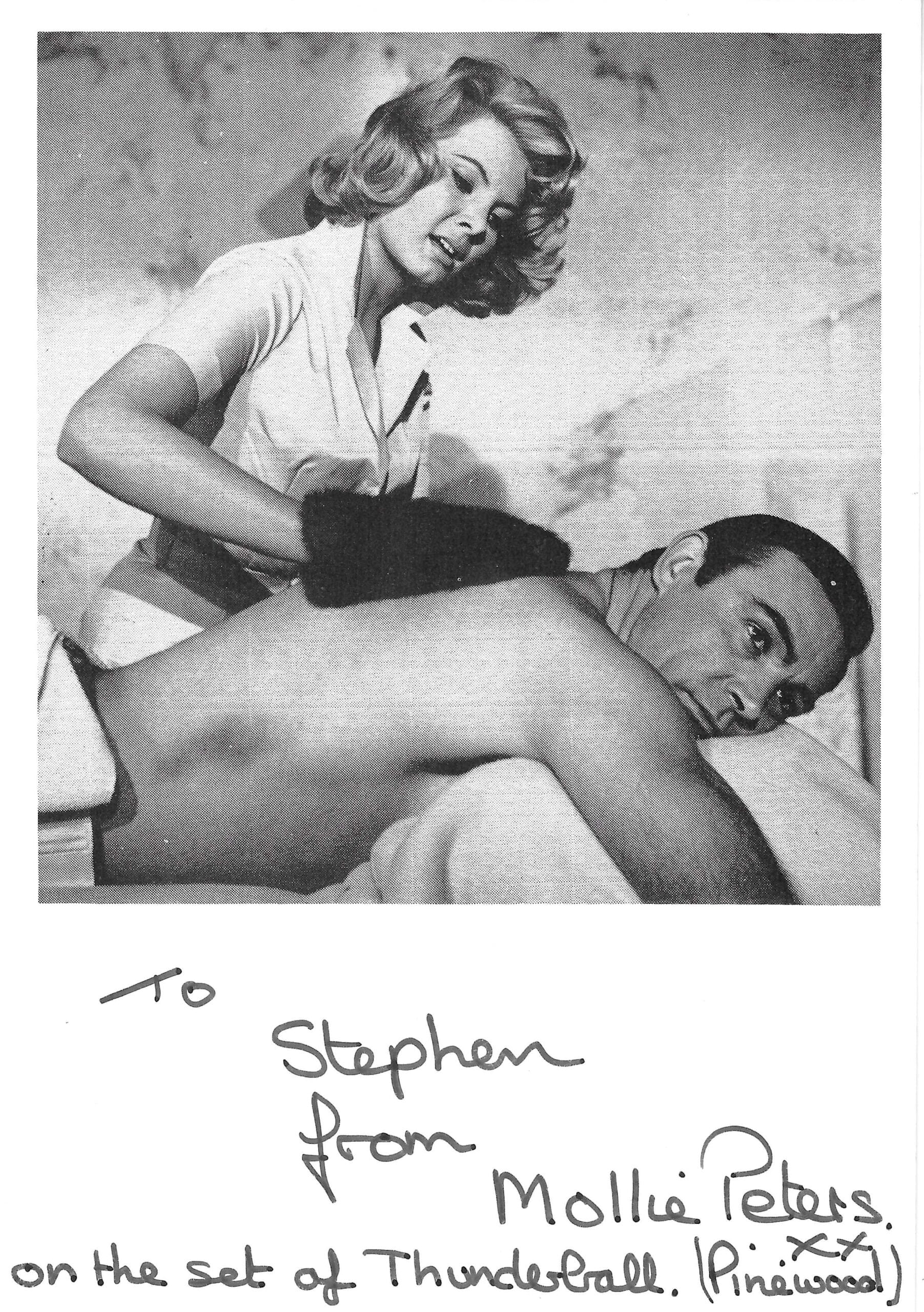 A lovely 3×5 inch photocard signed by actress Mollie Peters, who portrayed the role of Patricia Fearing in “Thunderball”.