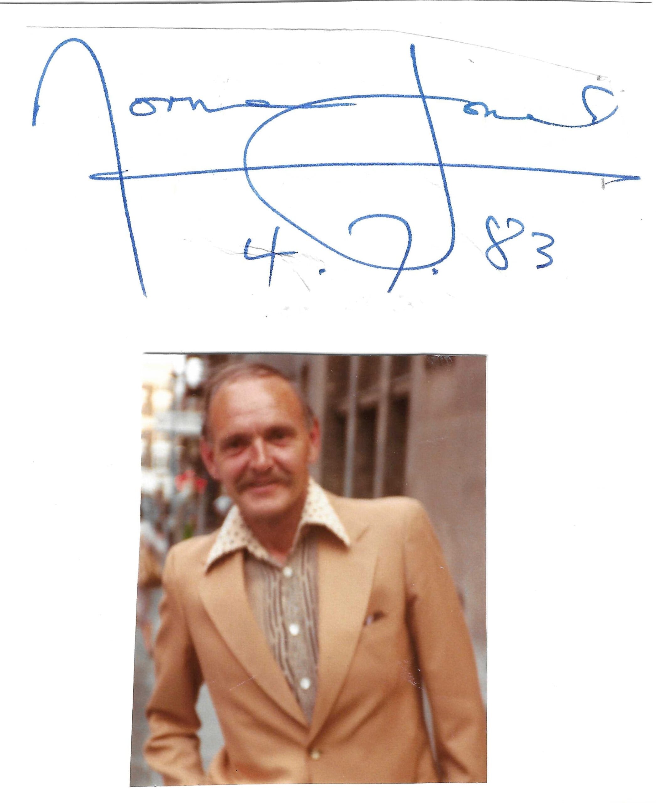 The autograph comes with a small candid photo of Norman Jones from the day of signing.