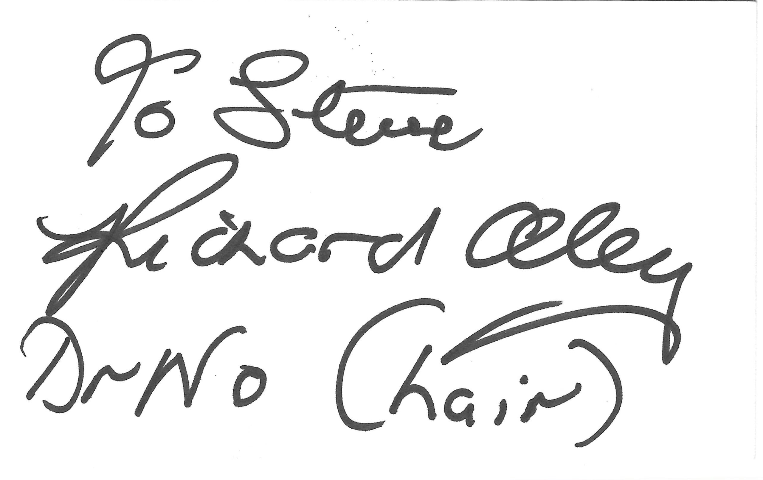 A white index card hand signed by actor Richard Olley, who was on the set of “Dr. No” for several days at Pinewood and assisted the production as a hair stylist.